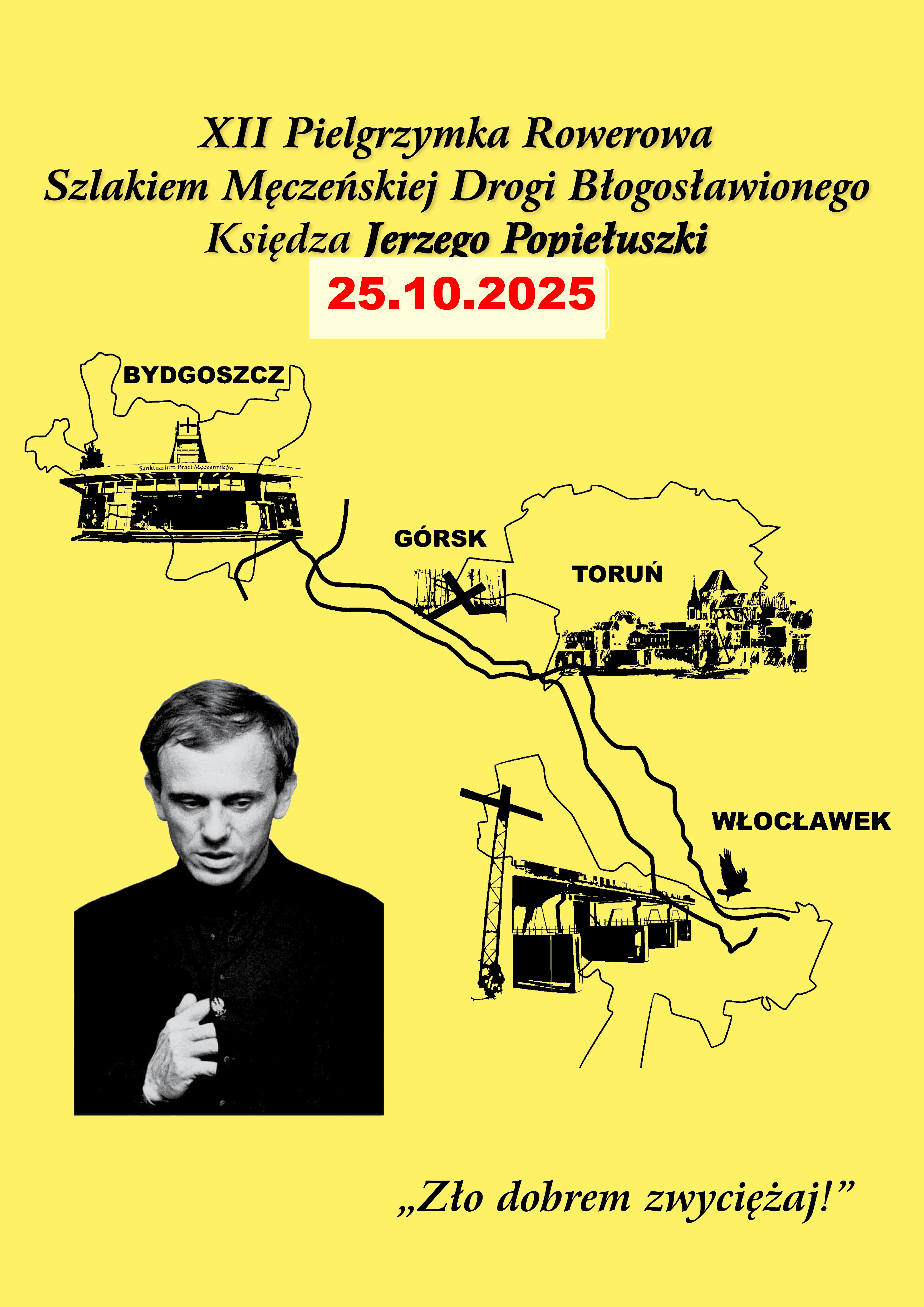 Stowarzyszenie Rowerowa Brzoza po raz siódmy organizuje Pielgrzymkę Rowerową Szlakiem Męczeńskiej Śmierci Błogosławionego Księdza Jerzego Popiełuszki trasie Bydgoszcz - Parafia Św. Polskich Braci męczenników, Górsk, Toruń, Włocławek – Krzyż przy tamie i Sanktuarium we Włocławku. Rowerowi pielgrzymi w ilości 120 osób wezmą udział w dniu 25 października 2025r. o godz.7,00 w Mszy Św. w Kościele Świętych Polskich Braci Męczenników w Bydgoszczy, po której wystartuje pielgrzymka rowerowa. Pielgrzymka zakończy się wspólną modlitwą w Sanktuarium Błogosławionego ks. Jerzego Popiełuszki we Włocławku, a ostatni znicz rowerowi pielgrzymi zapalą przy Krzyżu na tamie we Włocławku.